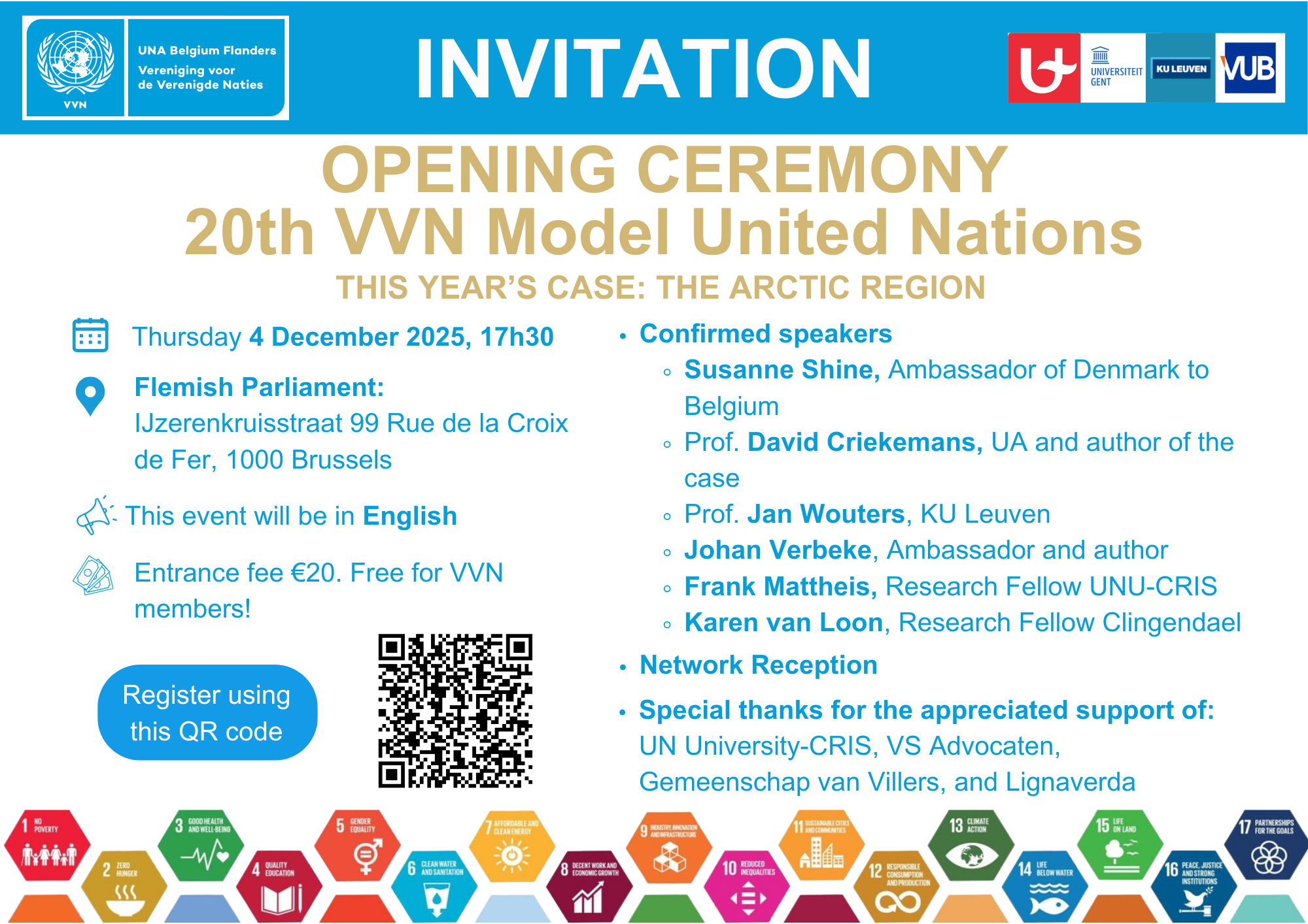 The opening ceremony of the twentieth edition of the VVN Inter-University Model United Nations will take place on Thursday 4 December 2025 at the Flemish Parliament in Brussels. The evening will bring together students, academics, diplomats and experts for a formal launch of the conference, featuring welcome addresses, reflections on the MUN’s twenty-year history, and introductory insights into this year’s case on the Arctic Region. The programme will set the tone for a weekend of negotiation, debate and diplomatic exchange, and offers participants the opportunity to meet speakers and fellow delegates ahead of the sessions.
